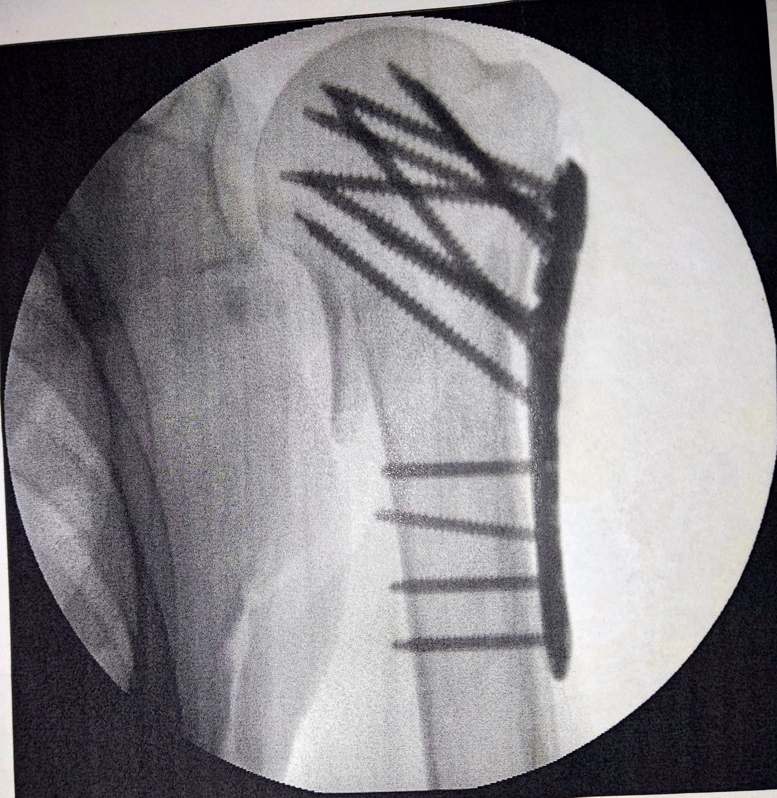 Hier auf dem Röntgenbild kann man die Platte und die Schrauben gut sehen.