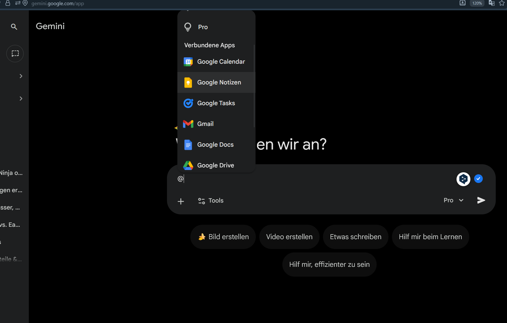 Warum ─ Gemini ist in allen Google-Apps integriert: Sheets, Docs, Gmail, NotebookLM, Maps, Search, Kalender, Notizen, YouTube und weitere. Was Google sonst noch so hat und macht, kann man auf Google Labs sehen. Das macht Gemini zu mehr als nur einem Chatbot – es ist ein mächtiges Werkzeug für mich. Das sieht man auch gut in Gemini selbst, wenn man @ eingibt. Dann kann man hoch- und runterscrollen und nachschauen, womit Gemini interagieren kann. Hier ein Screenshot davon.